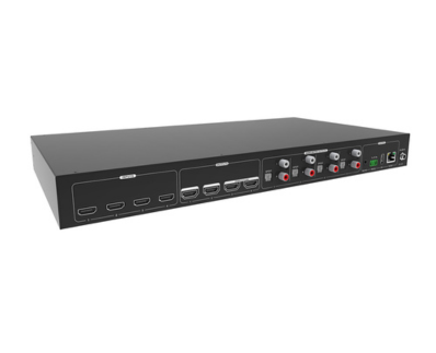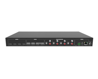This product is a professional 4x4 HDMI 18Gbps Matrix Switcher with Audio Matrix. It includes 4 HDMI inputs, 4 HDMI outputs and the last two outputs with down-scaling function, which is designed for switching two HDMI 18Gbps and HDCP2.3 compliant signals. It also features 4 SPDIF and 4 analog audio outputs for audio matrix.The matrix switcher features comprehensive EDID management and advanced HDCP handing to ensure maximum functionality with a wide range of video sources.The matrix switcher not only supports bi-directional IR, RS232 extension but also has IR, RS232, and TCP/IP control options.